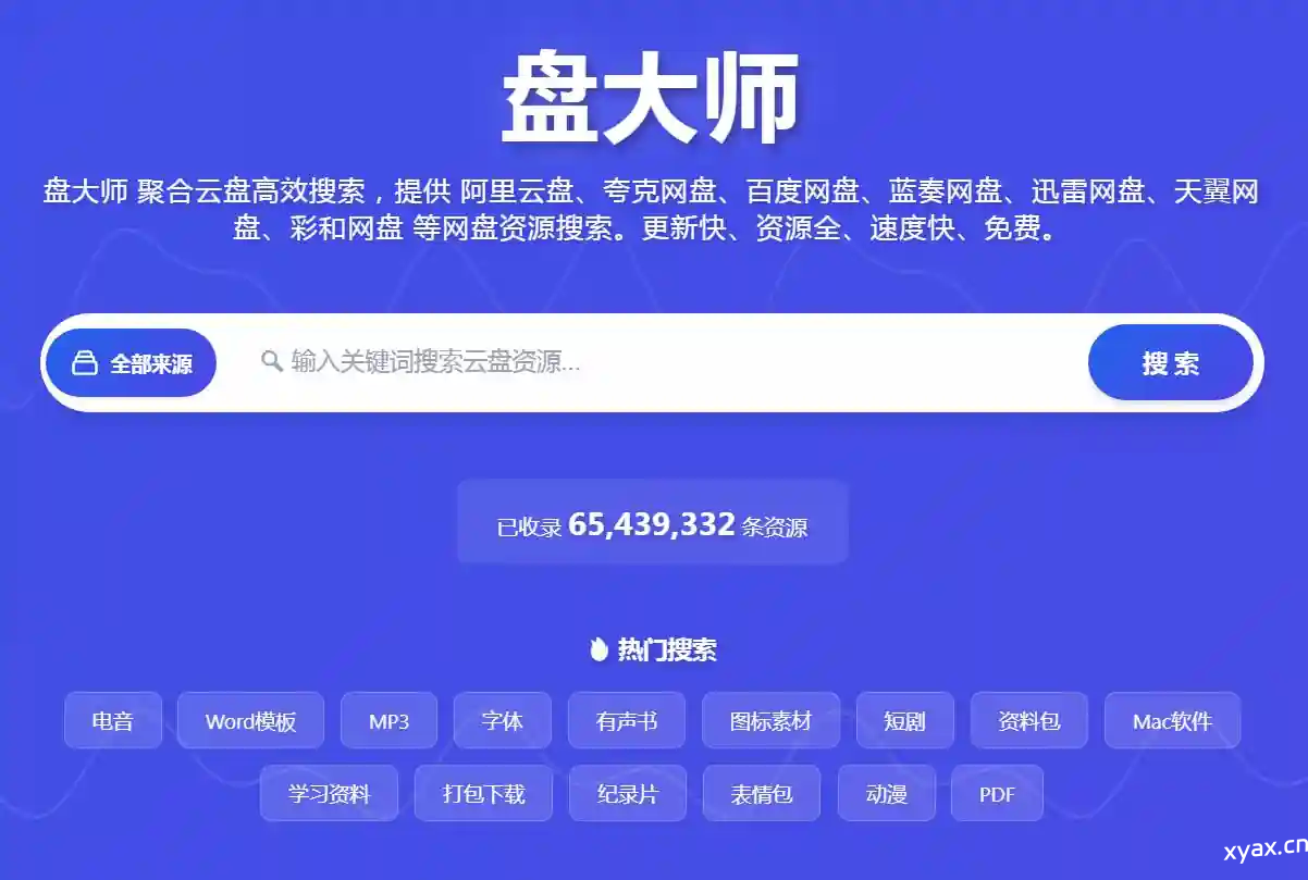 盘大师 聚合云盘高效搜索,提供 阿里云盘、夸克网盘、百度网盘、蓝奏网盘、迅雷网盘、天翼网盘、彩和网盘 等网盘资源搜索。更新快、资源全、速度快、免费。
