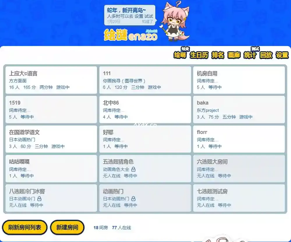 绘谜是一个支持线上绘画,猜题,投稿画作的网站。在主页选择喜欢的房间或新建房间即可开始游戏。若没有找到新建房间按钮,试试在设置页面取一个心仪的昵称并点击保存设置并回首页吧!