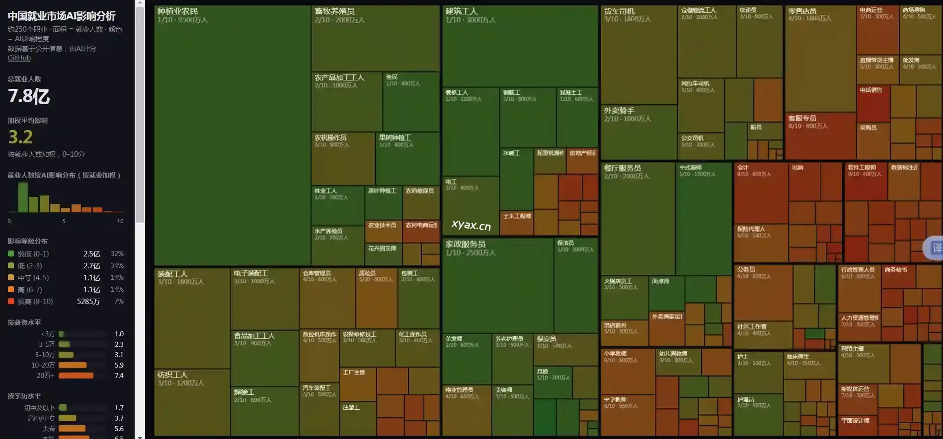 将职业数据与评分合并后,以树状图(Treemap)呈现。面积代表就业人数,颜色代表AI影响程度。