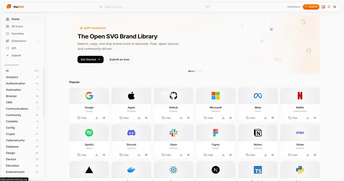 大多数图标库专注于UI图标。品牌标识散落在新闻资料包、Figma文件和随意的GitHub仓库中。theSVG是SVG图标的唯一来源——包括品牌标识、云架构图等。支持搜索、版本控制,并可通过npm包、CDN、CLI、API和MCP服务器获取。