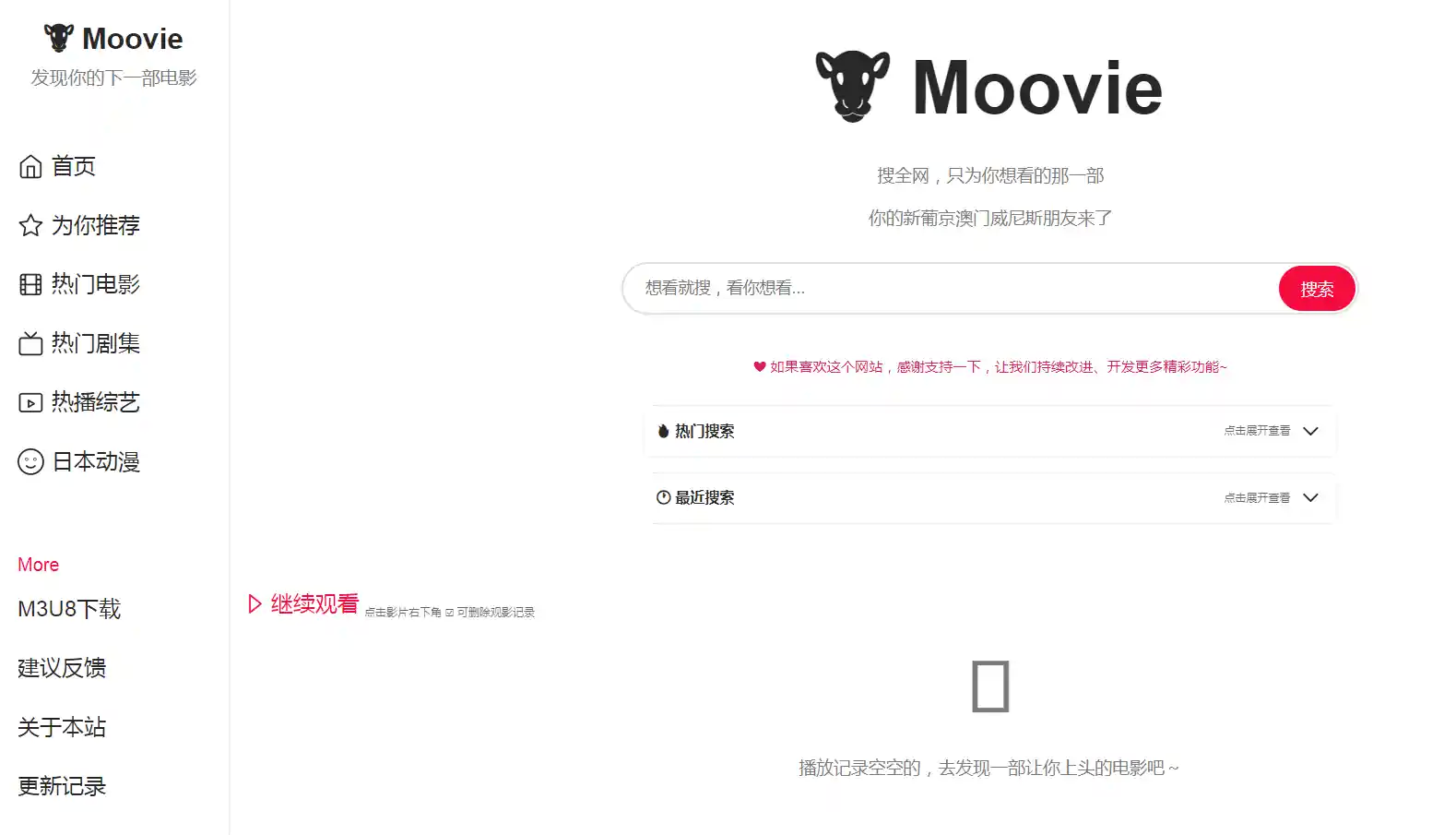 Moovie 是一个聚合全网影视资源的搜索网站,帮助你更快、更方便地找到想看的电影、电视剧和综艺节目。 不用操心内容分散在哪个平台,只需一次搜索,就能一览全网结果。