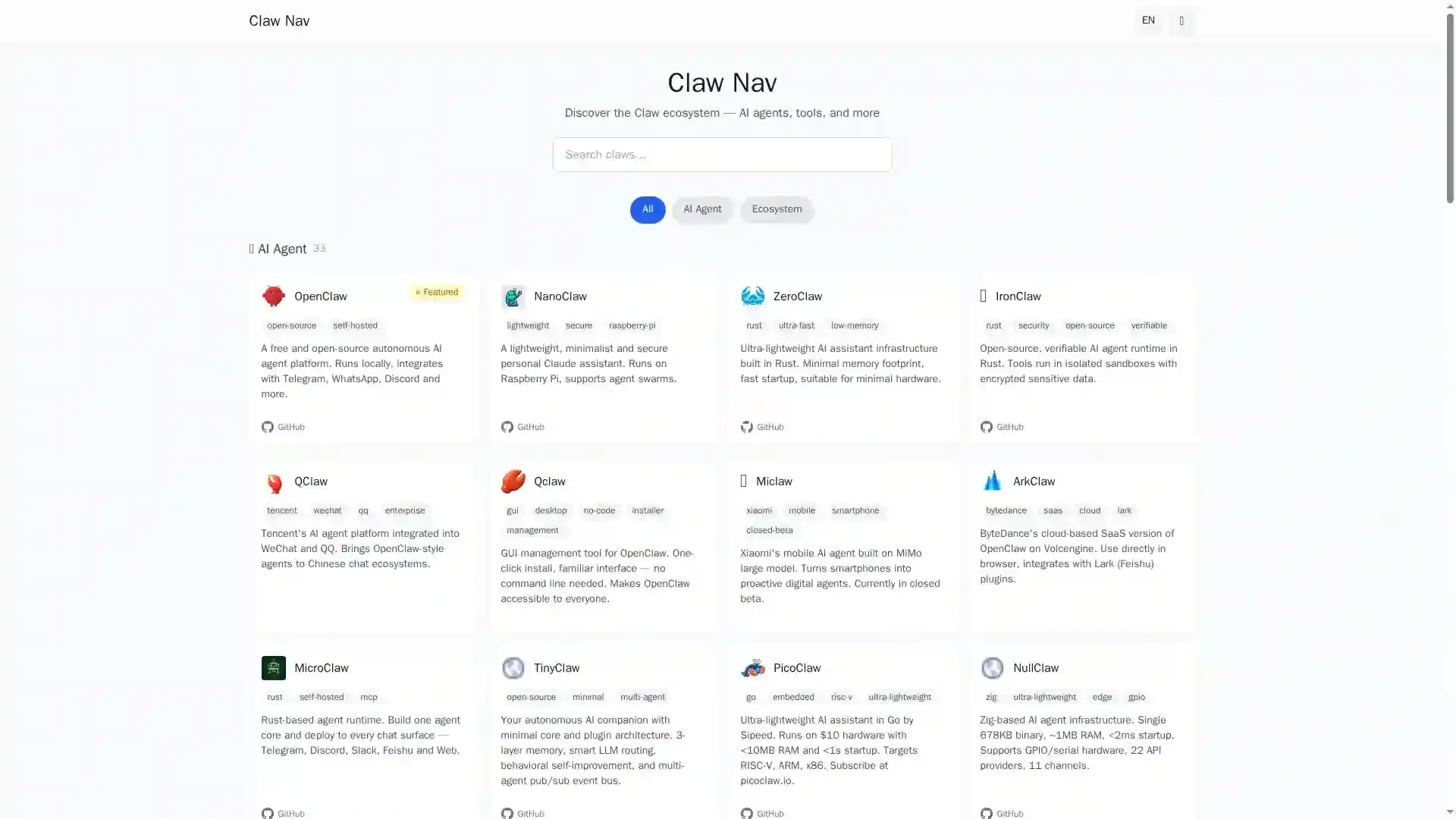 一个围绕 OpenClaw 生态打造的 AI 工具与代理(Agent)导航平台,主要用于聚合和发现各类 AI Agent、技能(Skills)、插件及相关工具资源。用户可以在该平台快速浏览不同 AI 自动化方案与工作流入口,了解当前流行的智能体应用场景,并跳转到对应项目或工具页面进行使用或部署。整体定位类似“AI Agent 导航站”,适合开发者或进阶用户探索 OpenClaw 生态及自动化能力扩展。
