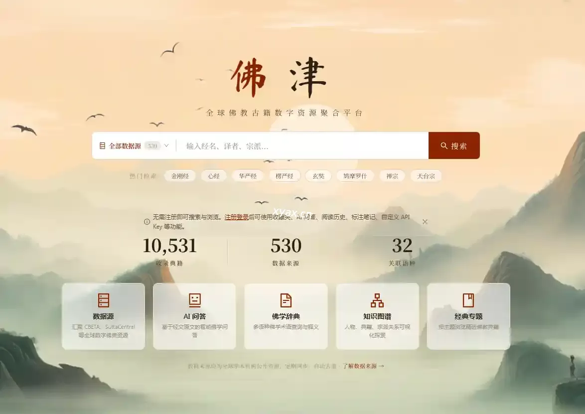一个聚合全球佛教文献资源的开源平台,整合了400+数据源与多语言内容,提供跨库全文搜索、平行对照阅读、知识图谱以及基于AI的问答功能,解决了佛学资料分散、检索困难的问题,让用户可以在一个网站中高效查找和阅读佛教经典文献。