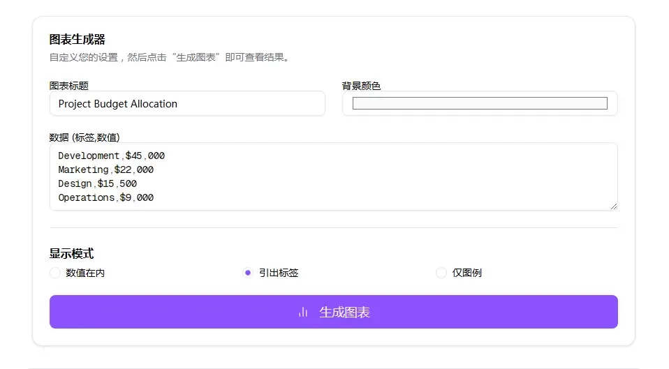 根据您的确切需求定制图表的视觉外观。为您的图表命名,选择标签的显示模式(在图表内部、带连接线或仅显示图例的简洁视图),并选择与您的品牌或演示主题相匹配的背景颜色。
