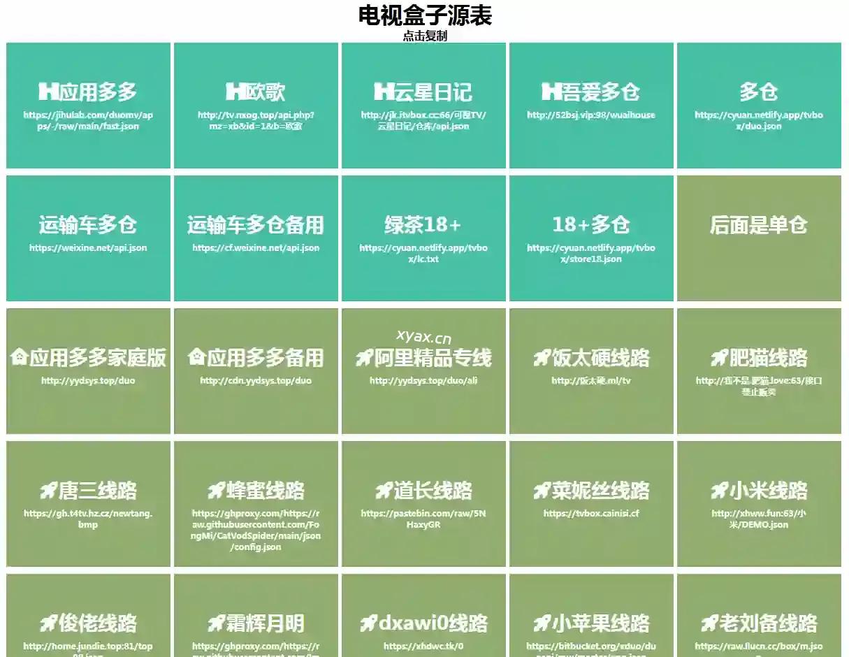 一个提供电视盒子的源的网站,可以通过点击链接获取各种视频源和应用程序的接口。包括应用多多、欧歌、云星日记等,可以复制和使用这些链接来观看不同的影视内容。