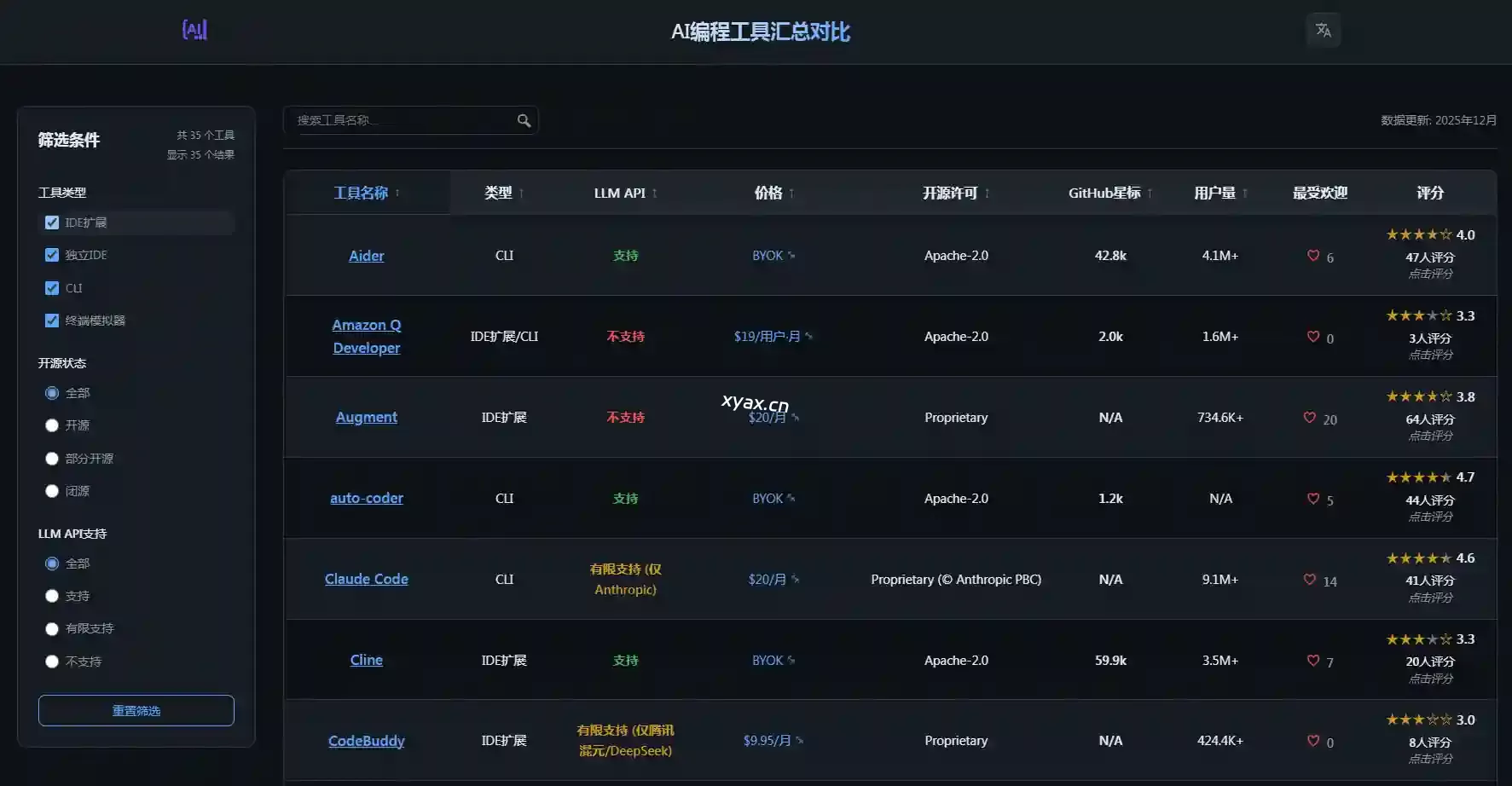 以通过多种过滤条件(如工具类型、开源状态和定价)来查找和比较不同的工具。还提供用户统计数据、工具评分和使用情况,帮助开发者做出明智的选择。