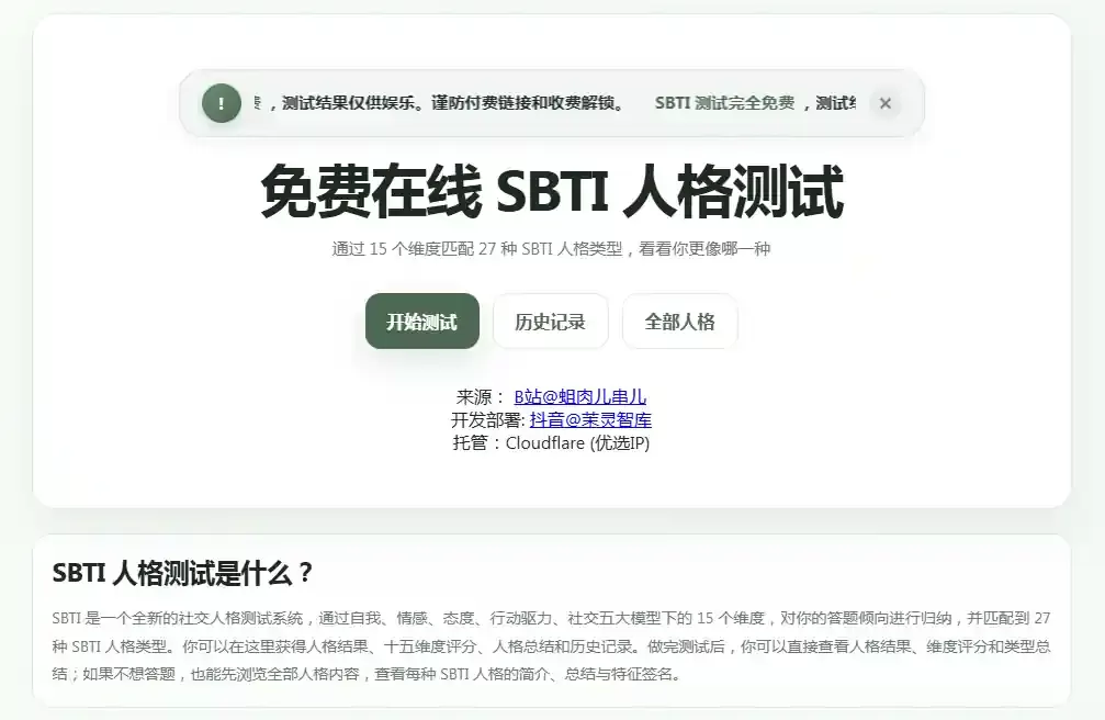 SBTI 是一个全新的社交人格测试系统,通过自我、情感、态度、行动驱力、社交五大模型下的 15 个维度,对你的答题倾向进行归纳,并匹配到 27 种 SBTI 人格类型。你可以在这里获得人格结果、十五维度评分、人格总结和历史记录。做完测试后,你可以直接查看人格结果、维度评分和类型总结;如果不想答题,也能先浏览全部人格内容,查看每种 SBTI 人格的简介、总结与特征签名。