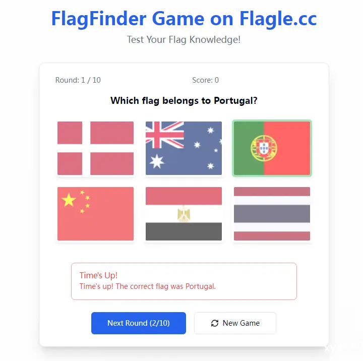 FlagFinder是Flagle.cc上提供的一款有趣且具有教育意义的游戏,旨在测试您对世界旗帜的了解。在每一轮比赛中,你会看到六面国旗,并被赋予一个国家的名字。您的目标是在计时器用完之前选择与国家名称匹配的正确旗帜。