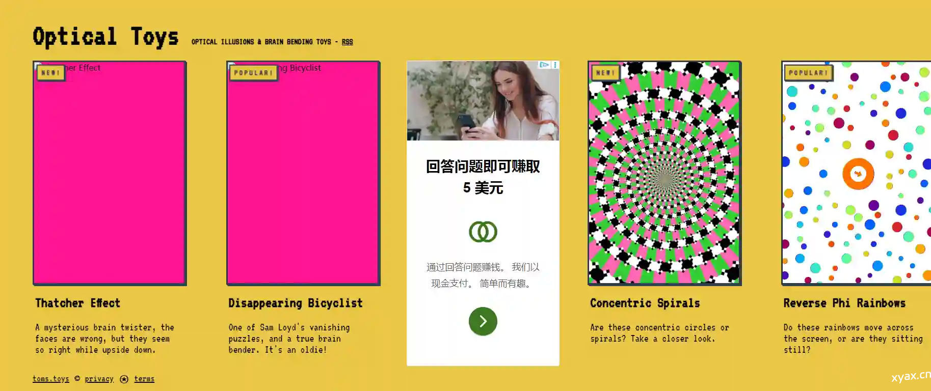 Toms toys的视错觉和光学玩具收集网站。 在线网址:https://optical.toys/ 声明:本站内容均收集于互联网,如不慎侵犯到您的版权利益,请附带相关证明文件来信本站将立即予以下架删除。